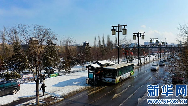 雪天大同公交、大同古城、藍(lán)天。新華網(wǎng) 發(fā)(趙文貴 攝)