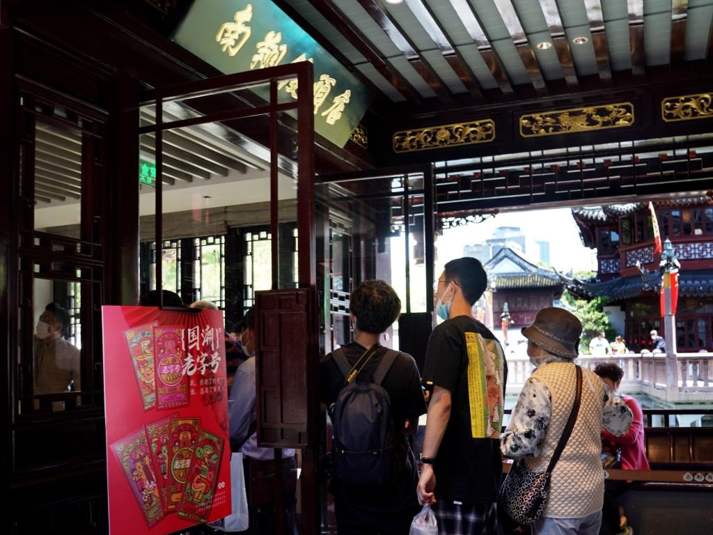 2020年5月12日,在上海豫園南翔饅頭店門(mén)口,消費(fèi)者從“國(guó)潮”廣告牌旁經(jīng)過(guò)。新華社記者 劉穎 攝
