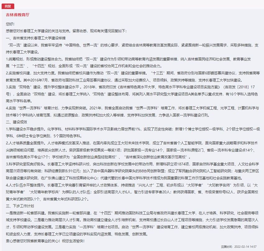 吉林省教育廳回復了網(wǎng)友的留言,并對吉林省高校建設工作進行了詳細闡述。