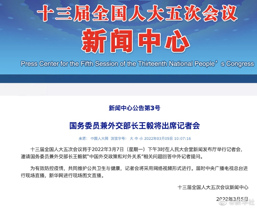 十三屆全國(guó)人大五次會(huì)議將于3月7日(星期一)下午3時(shí)在人民大會(huì)堂新聞發(fā)布廳舉行記者會(huì),邀請(qǐng)國(guó)務(wù)委員兼外交部長(zhǎng)王毅就“中國(guó)外交政策和對(duì)外關(guān)系”相關(guān)問(wèn)題回答中外記者提問(wèn)。
