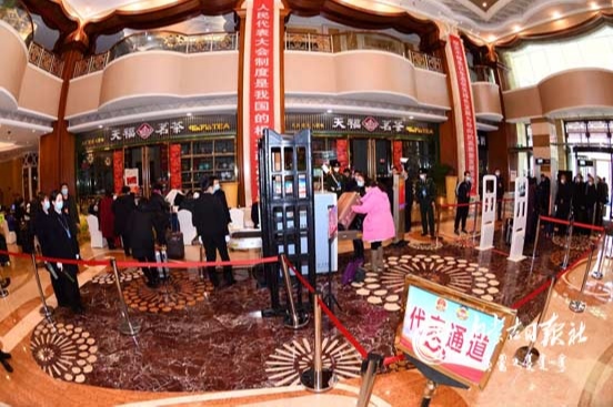 出席會(huì)議的人大代表正在通過(guò)安檢進(jìn)入駐地。
