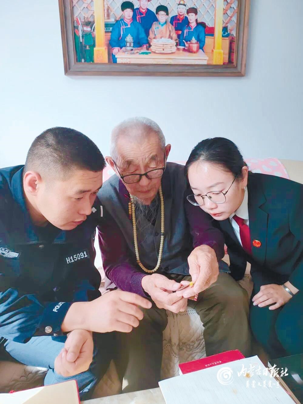 老黨員為青年干警介紹自己獲得的勛章。近日,錫林郭勒盟蘇尼特左旗人民法院組織青年干警來到91歲的老黨員阿日德那巴吉爾家中,聆聽老人講述黨史故事,接受革命傳統(tǒng)教育。(內(nèi)蒙古日報記者 李晗 攝)