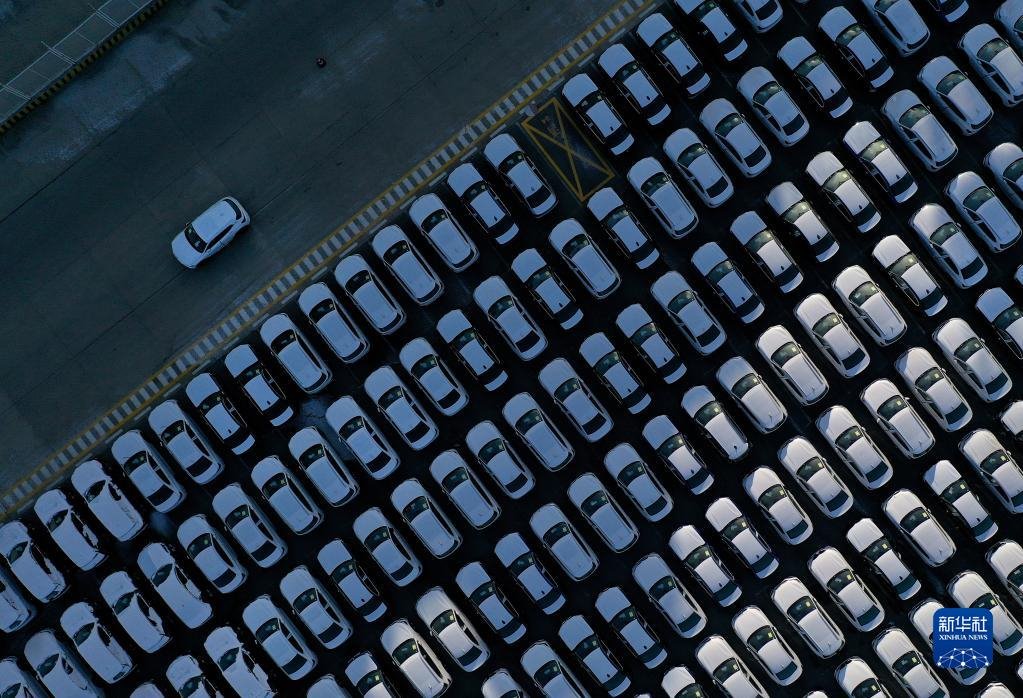 2021年1月29日,一輛運(yùn)送中的商品車行駛在大連港汽車碼頭(無人機(jī)照片)。新華社記者 姚劍鋒 攝