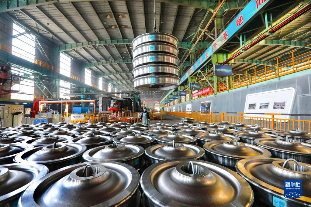 3月3日,在中國寶武馬鋼一車輪生產(chǎn)車間,成品車輪在吊裝準備發(fā)貨。新華社發(fā)