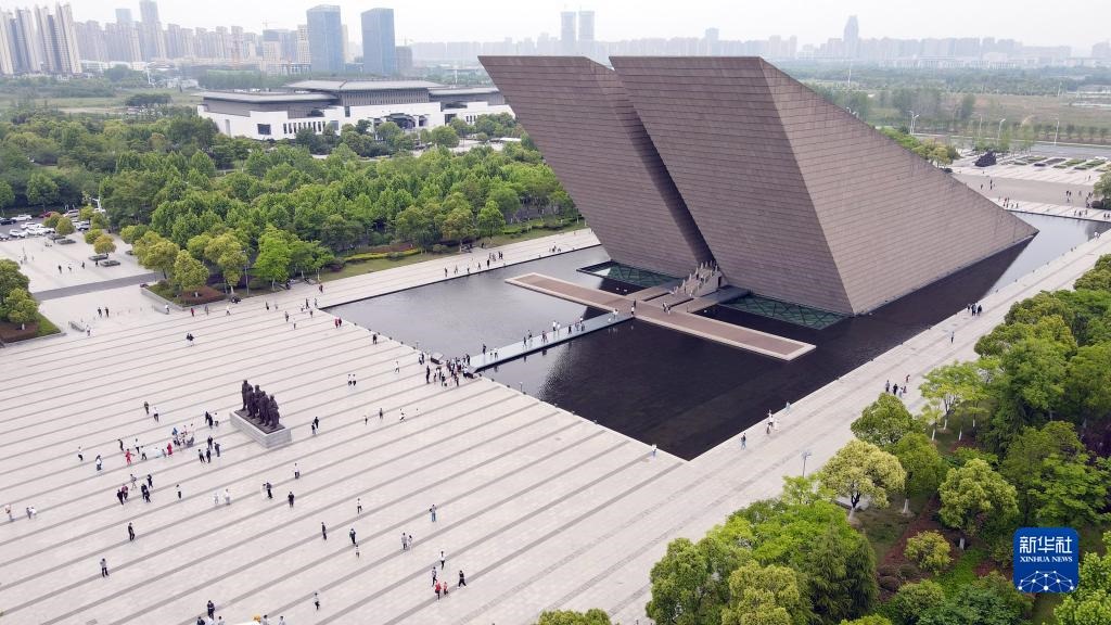 游客在渡江戰(zhàn)役紀念館參觀游覽(2021年5月3日攝,無人機照片)。新華社記者 周牧 攝